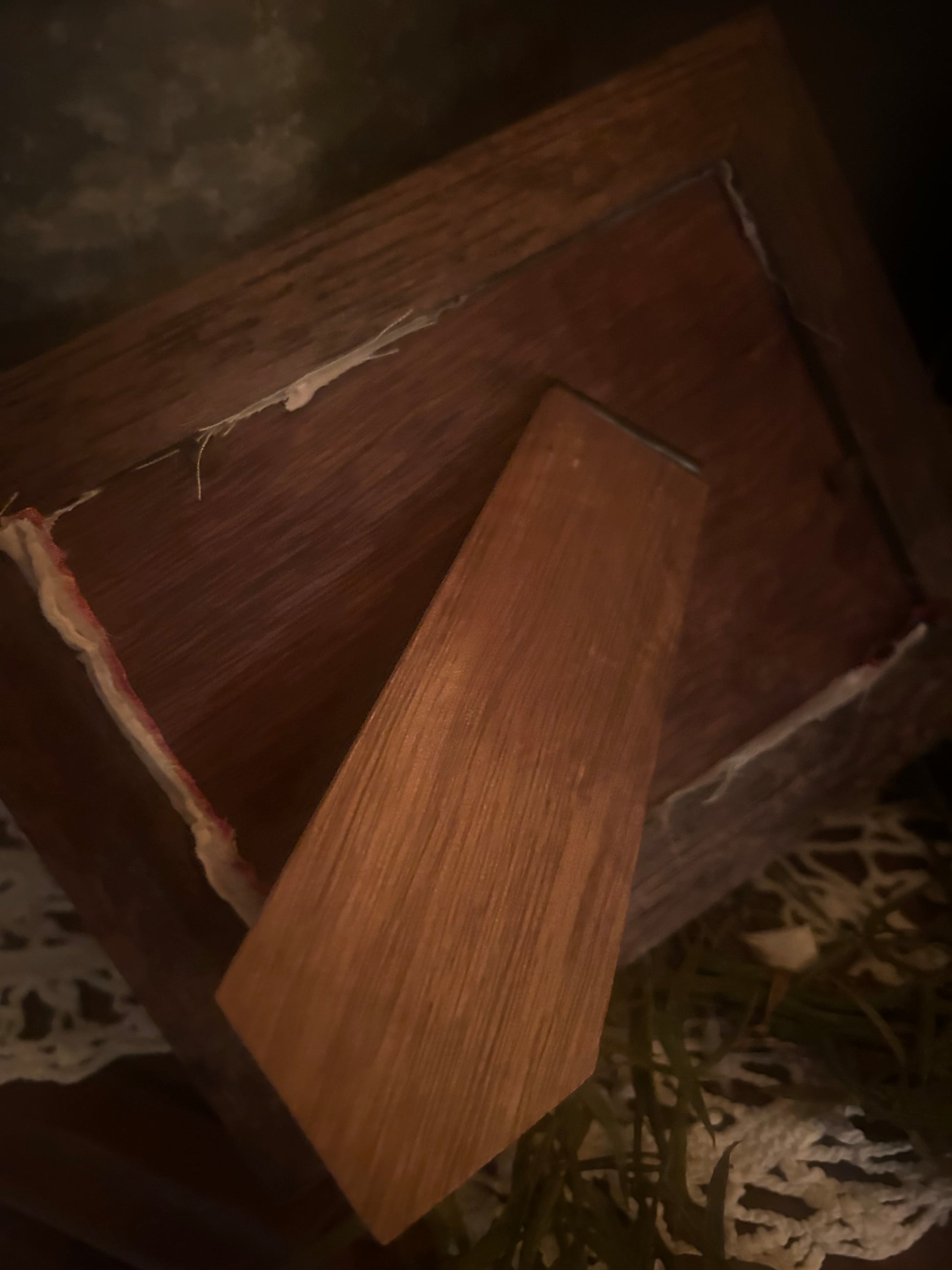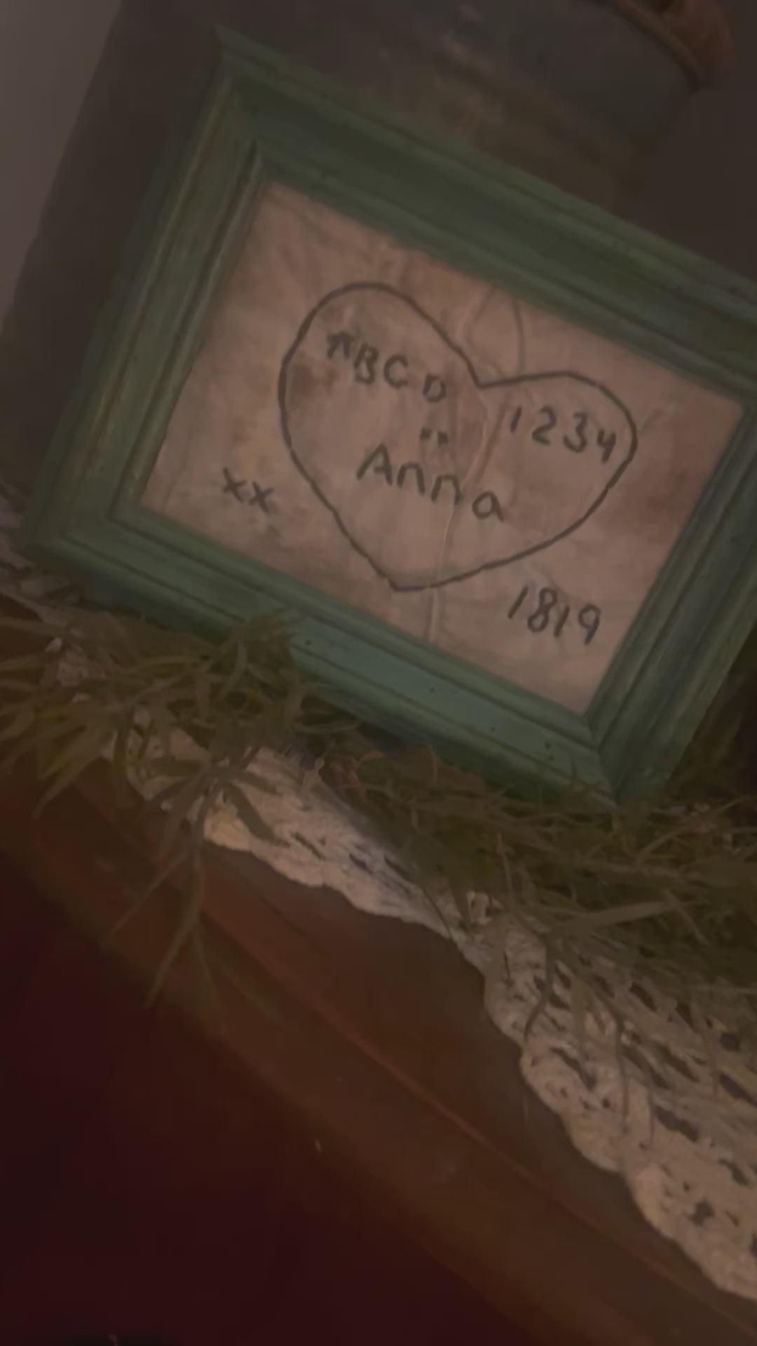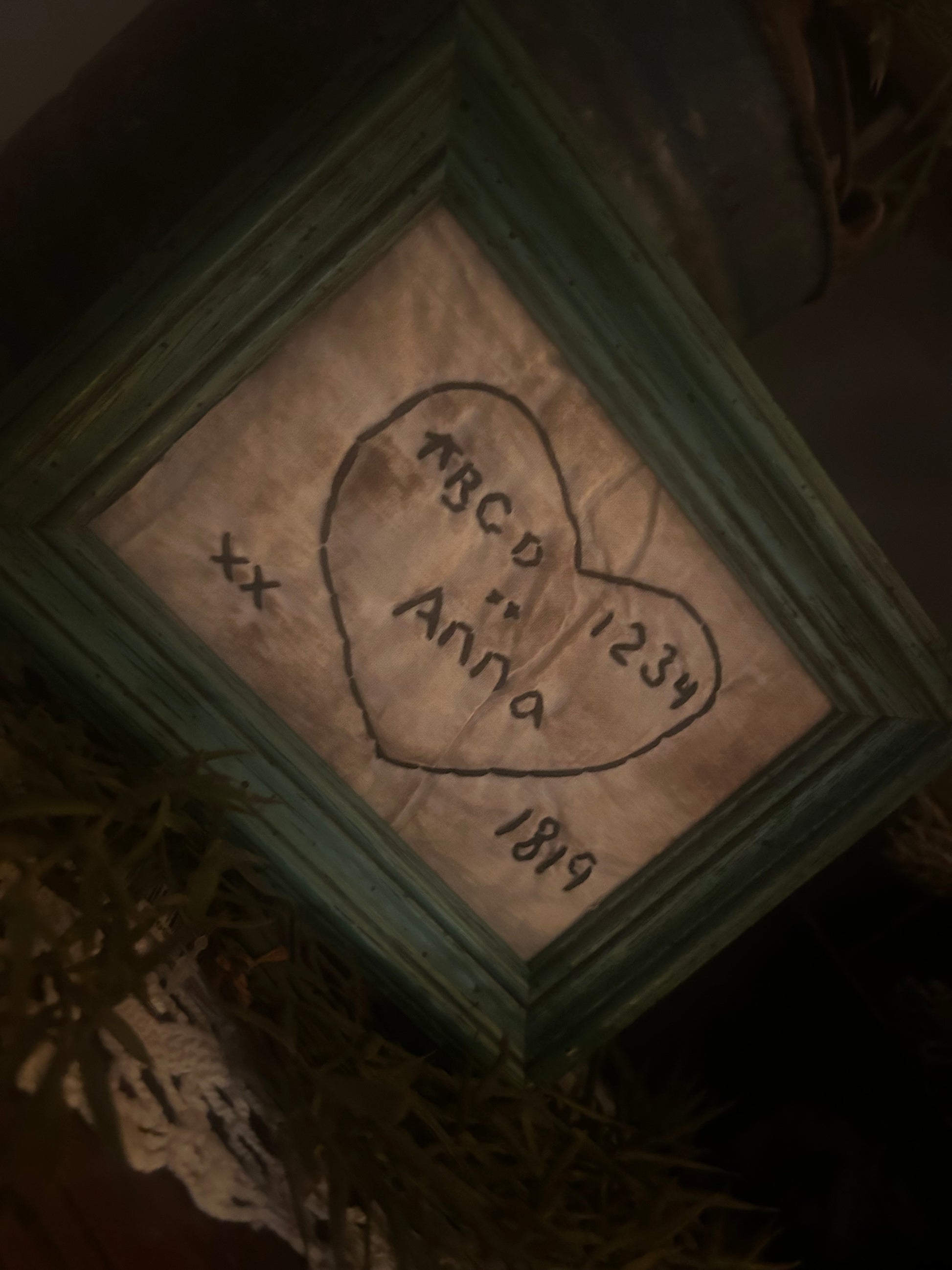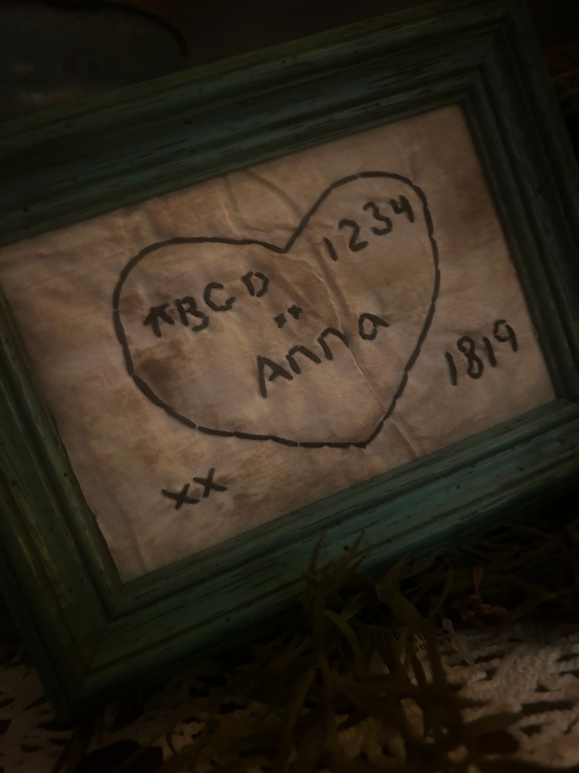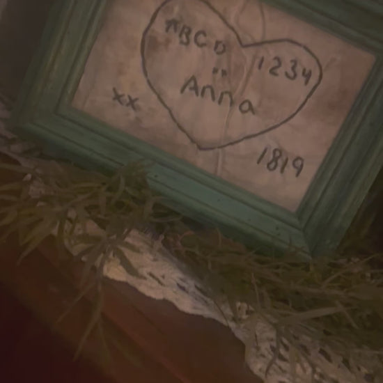 We took a vintage wooden frame and paired it with our handmade one of a kind sampler.