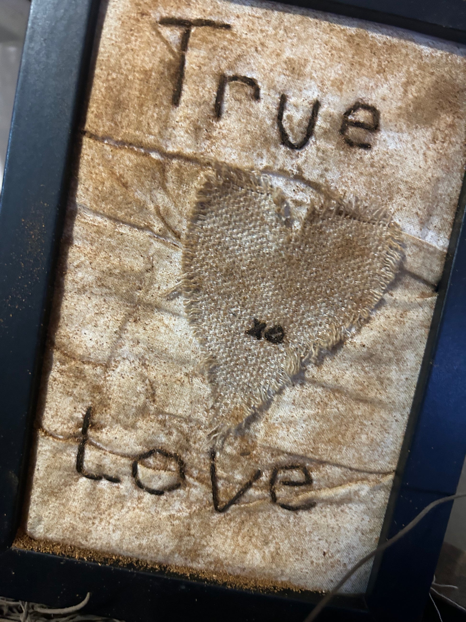 Our True Love hand stitched sampler is stitched in brown on a vintage feedsack.
